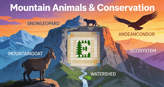 For International Mountain Day, explore the unique wildlife of the high peaks! Find animals like SNOW LEOPARD, ANDEAN CONDOR, and BIGHORN SHEEP, plus key conservation terms. An educational and timely puzzle for nature lovers.